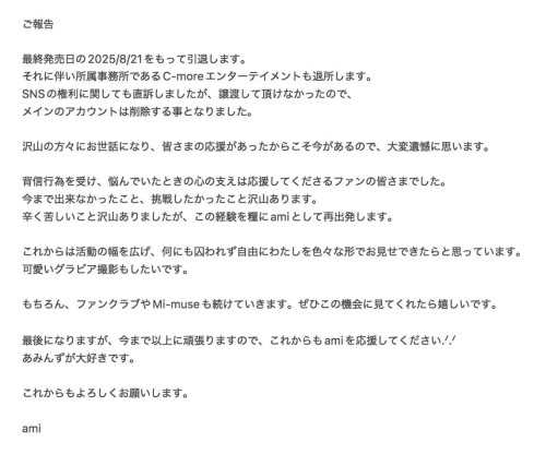 在拋弃原有艺名并且要求大家追踪自己的新帐号(https://x.com/ami__t1010)后,時田亜美(时田亚美)终于发表声明说明一切,8月21日,最后的作品发表后她就要引退了: