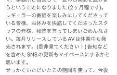 看到这篇公告跳出来,你是不是吓了一跳?紗倉まな (纱仓真菜 )怎么了?直翻就是她要休业了,为期两个月,不过也不用太紧张,虽然她会暂停工作,不过片子还是会正常发行,这两天SOD还会有大型企划宣布,社群则是会不定时更新⋯