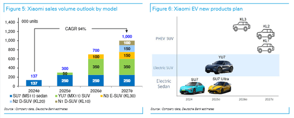 此外,德意志银行曾预测,小米汽车业务将在2026年盈利,小米的净利润总额将以40%的复合年增长率持续增长,从2024年的200亿元攀升至2027年的547亿元,同时,其总营收也将以17%的复合年增长率达到2027年的9170亿元。