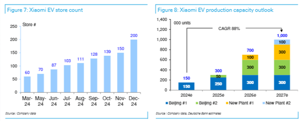 尤为引人注目的是小米的汽车业务。尽管目前仍处于亏损状态,但这是新业务发展的必经之路。据德意志银行分析师预测,随着小米YU7在2025年年中的发布以及汽车交付量的持续提升,小米汽车有望在2026年实现盈利。未来,小米的净利润总额预计将以40%的复合年增长率持续增长,从2024年的200亿元跃升至2027年的547亿元。同时,其总营收也将以17%的复合年增长率稳步攀升,至2027年有望达到9170亿元。